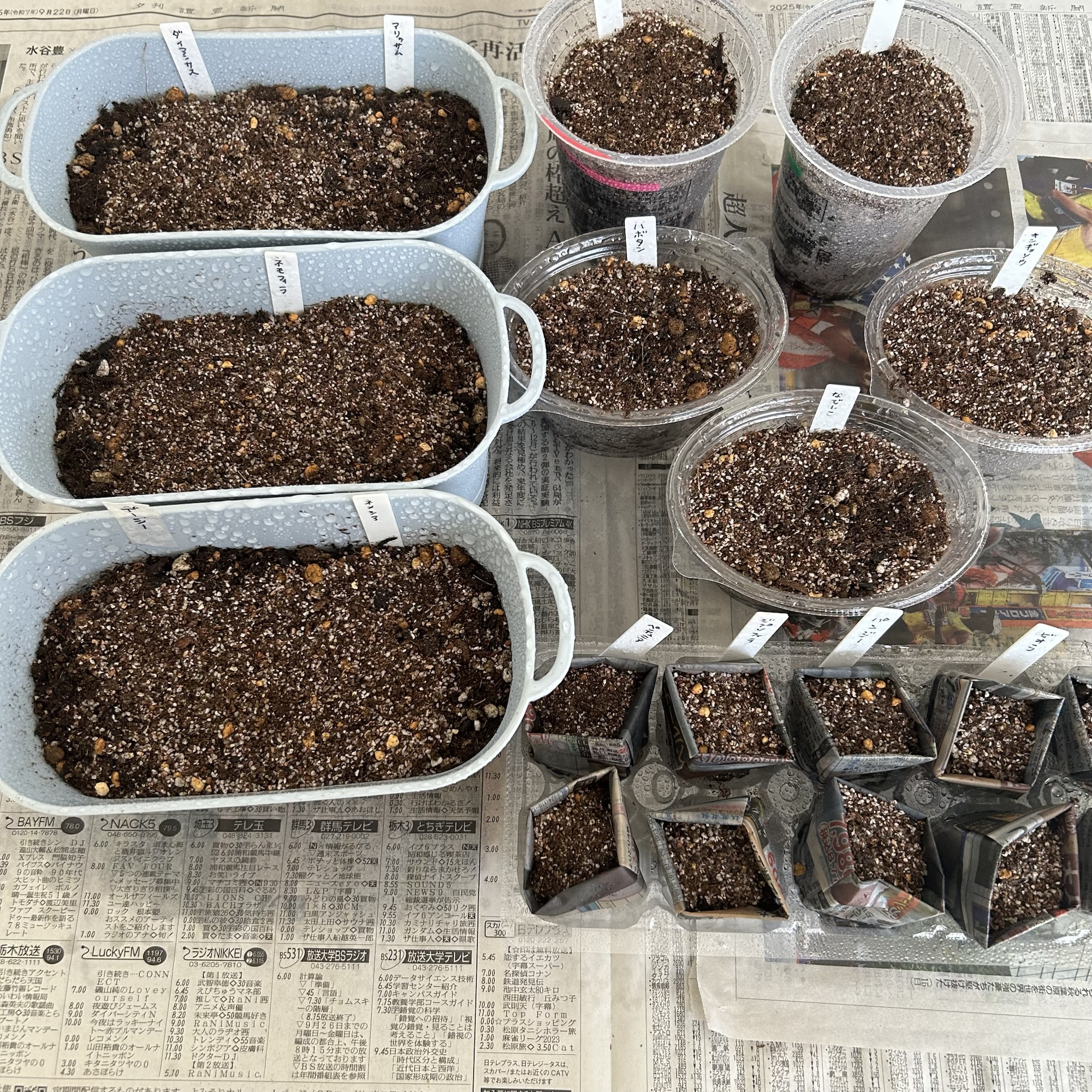 土はいつもと同じく、普通の培養土の上に種まき用土を乗せています。